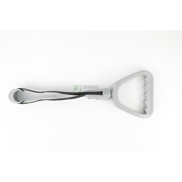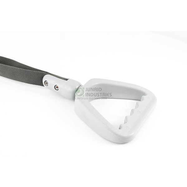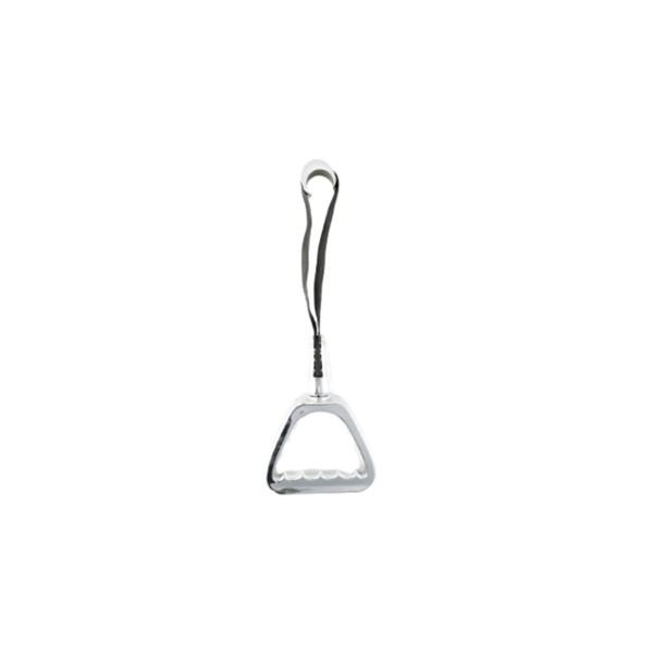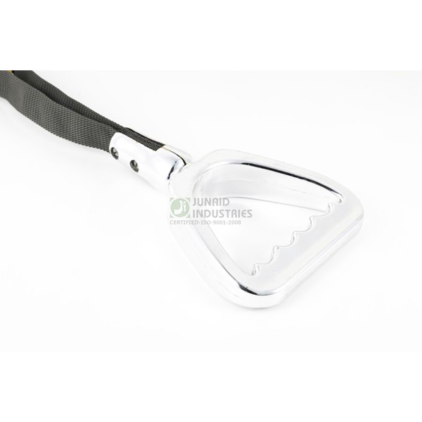A chrome-finished hand standee designed for durability and an elegant look. The polished handle and strong strap make it suitable for buses requiring both strength and an enhanced interior finish.